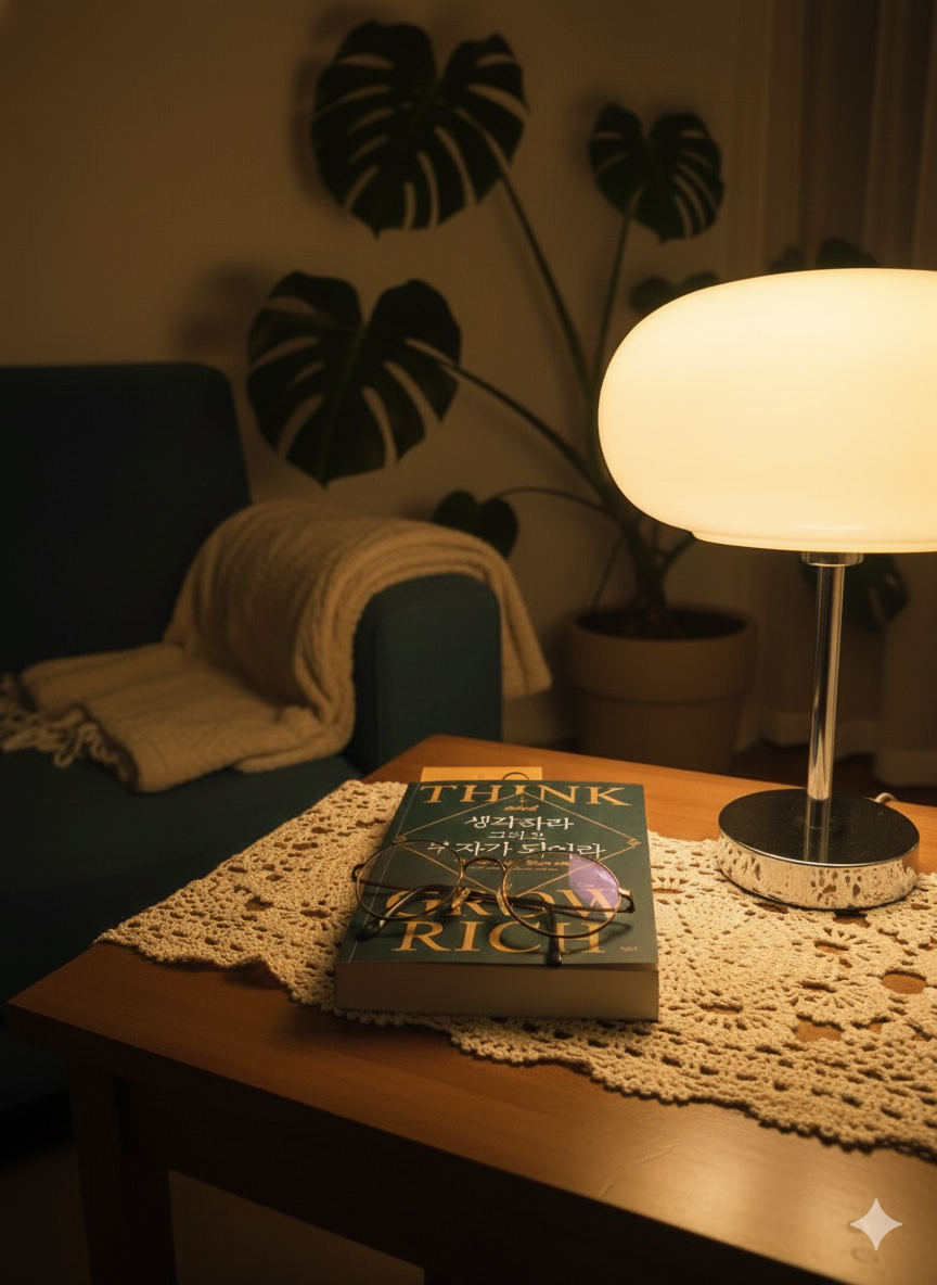 이곳은 제가 만든 '해방의 코너'입니다. 바쁜 하루 끝에 이 조명을 켜면, 저는 온전한 '나'로 돌아옵니다. 지금 읽고 있는 이 책처럼, 저의 생각도 부자가 되고 싶다는 작은 바람도 담겨 있는 곳이죠.
